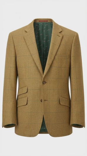 A classic tailored jacket in warm mustard tweed with a subtle windowpane check. Finished with a ticket pocket and a distinctive green pheasant-print lining for a refined country touch. Perfect for race days, weddings and smart autumn occasions.